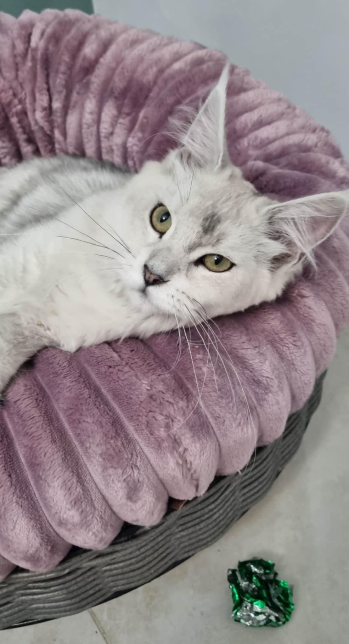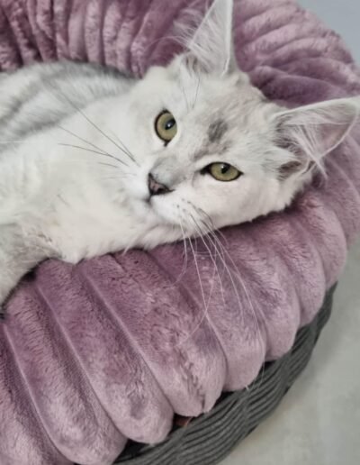 Alaska is a polydacle with 6 toes on each paw. She arrived from a lovely small cattery from France. Alaska is very sociable and settled in immediately. Also, our future queen.